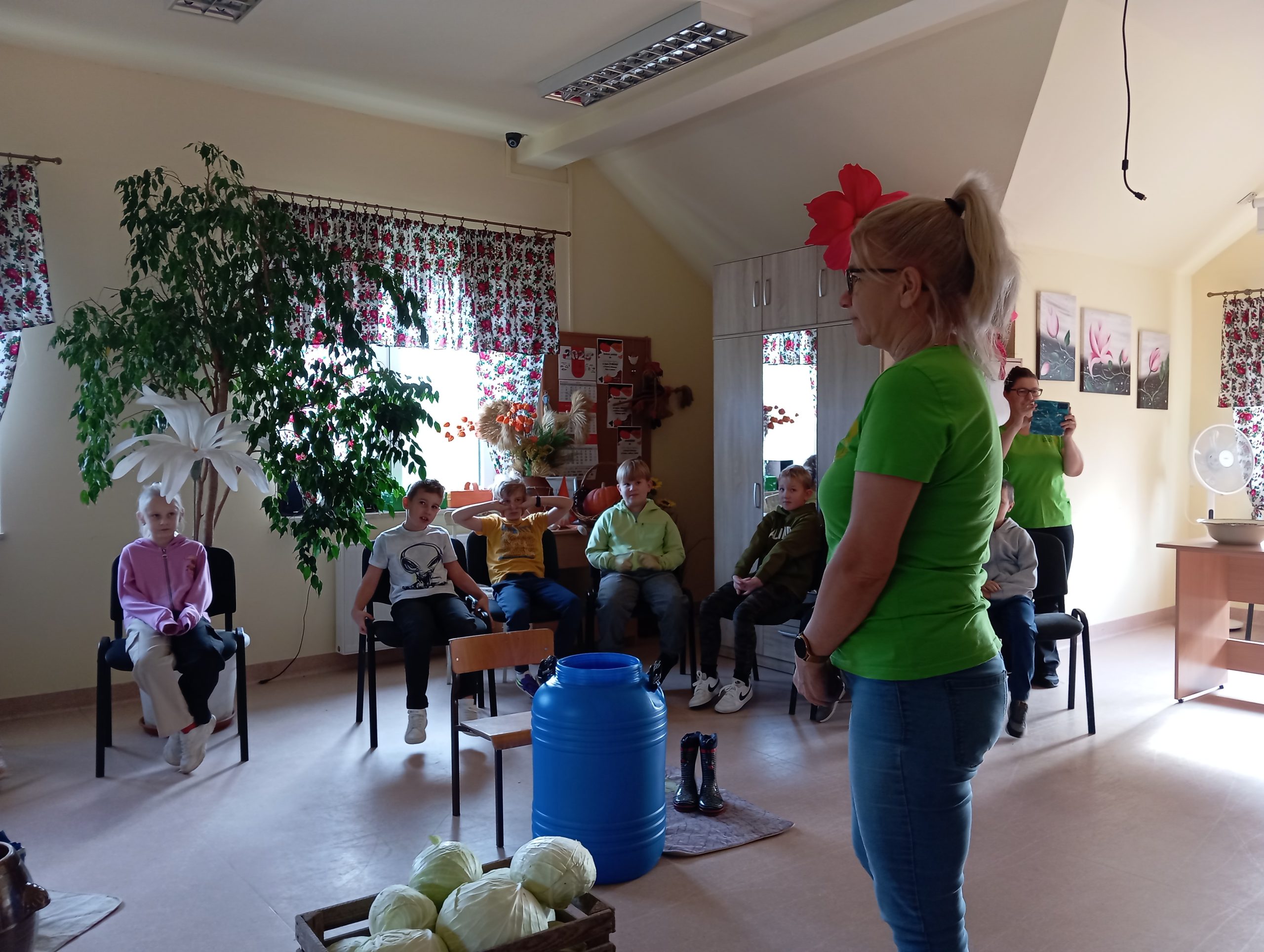 6 października uczniowie klas II A I II B uczestniczyli w warsztatach z kiszenia kapusty przygotowanych przez panie z Koła Gospodyń Wiejskich Etno Babki. Z zaciekawieniem wysłuchali opowieści o pracy rolnika, zaletach wykorzystywania produktów naturalnych, uprawianych w polu. Poznali etapy kiszenia kapusty. Następnie z zaangażowaniem zabrali się do pracy - obierali i ścierali marchew, kapustę a następnie przeszli do części sprawiającej im największą radość – zakładanie kaloszy i ubijanie kapusty w beczce. Po wykonanej pracy na naszych uczniów czekała bardzo miła niespodzianka – babeczki i ciasto - pyszności przygotowane przez panie z KGW.