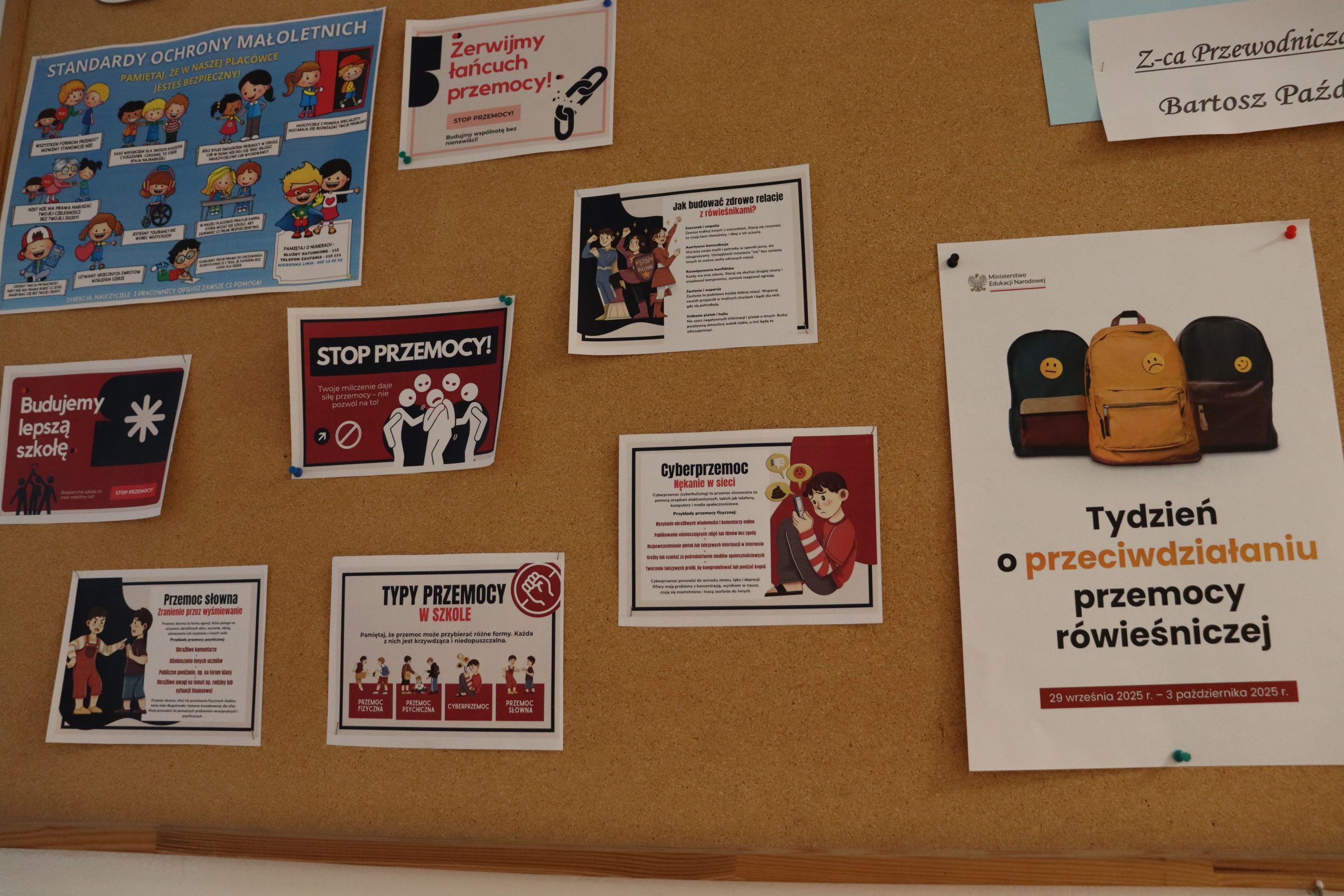 W dniach 29 września – 3 października 2025 r. w naszej szkole odbył się Tydzień Przeciwdziałania Przemocy Rówieśniczej oraz Tydzień Budowania Relacji. Głównym celem tej inicjatywy było promowanie empatii, szacunku i wzajemnego wsparcia wśród uczniów, a także budowanie atmosfery zaufania i bezpieczeństwa w środowisku szkolnym. W ramach obchodów podejmowaliśmy szereg działań wychowawczo-edukacyjnych, podczas których poruszaliśmy m.in. następujące zagadnienia: Jak rozpoznawać i reagować na przemoc? Dlaczego warto dbać o dobre relacje? Jak tworzyć bezpieczną i przyjazną atmosferę w szkole? Działania, które zostały realizowane w ciągu tego tygodnia: - Bajki terapeutyczne, czytane dzieciom oraz później omawiane, - Gra terenowa
