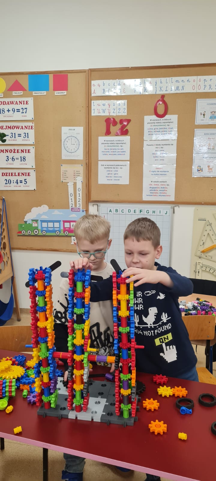 W ramach projektu „Laboratoria Przyszłości” uczniowie klas 2a i 2b uczestniczyli w zajęciach kreatywnych z wykorzystaniem klocków Korbo. Celem spotkania było rozwijanie wyobraźni przestrzennej, współpracy w grupie oraz poznanie zasad działania mechanizmów wprawianych w ruch. Dzieci pracowały w kilkuosobowych zespołach, projektując i konstruując budowle wyposażone w elementy ruchome, takie jak koła zębate, wirujące mechanizmy czy obracające się ramiona. Uczniowie eksperymentowali z różnymi rozwiązaniami, sprawdzając, jak ruch jednego elementu wpływa na pozostałe. W trakcie zajęć panowała twórcza atmosfera – uczniowie dzielili się pomysłami, testowali swoje konstrukcje oraz wprowadzali poprawki, aby mechanizmy działały jak najsprawniej. Zajęcia pozwoliły dzieciom rozwijać logiczne myślenie,