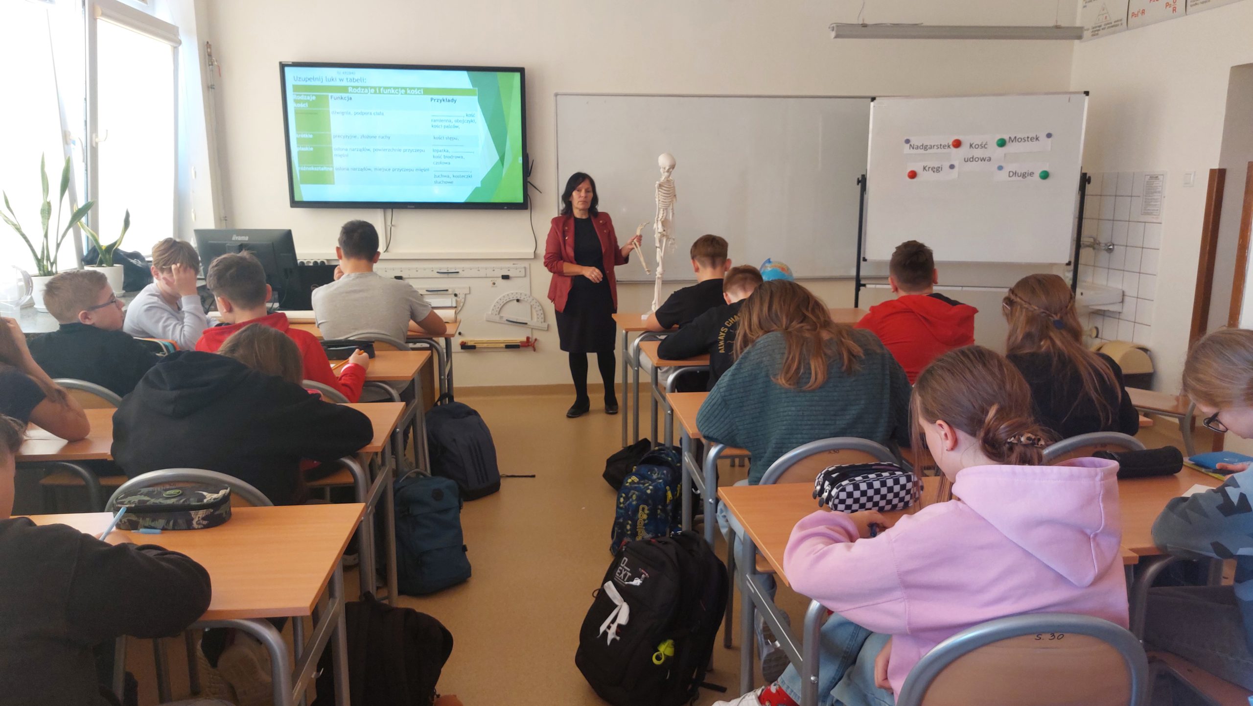 04.11 uczniowie klasy 7 wzięli udział w lekcji interdyscyplinarnej łączącej wiedzę z różnych dziedzin: język polski, biologia, matematyka, geografia. Tłumaczyli dosłowne i przenośne (metaforyczne) znaczenie zwrotu „porachować kości”. Szukali w poznanych lekturach przykładów walki, kary lub groźby, odwołujących się do przenośnego znaczenia zwrotu. Powtarzali budowę i funkcje szkieletu, rodzaje i funkcje kości. Wskazywali lokalizację i znaczenie najważniejszych znalezisk ewolucyjnych ("Lucy"). A na koniec utrwalali obliczenia procentowe wyznaczając między innymi ile ważą ich kości. Zajęcia przeprowadziła p. Anna Wrona i p. Katarzyna Gadawska. W przygotowaniu lekcji pomagała p. Magdalena Kędziora.