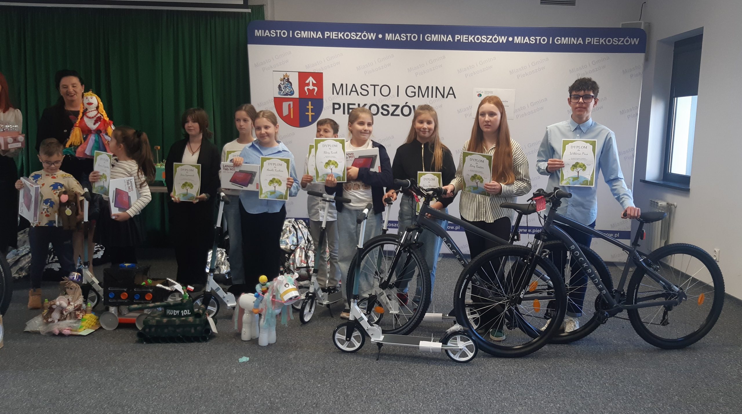 Nasi Uczniowie Nagrodzeni!! Z przyjemnością informujemy, że w konkursach ekologicznych dotyczących ochrony powietrza, organizowanych przez Urząd Miasta i Gminy w Piekoszowie pięcioro uczniów Naszej Szkoły otrzymało nagrody i wyróżnienia. W dniu 4.11.2025r. z rąk Burmistrz Miasta i Gminy Piekoszów Pani Teresy Jakubowskiej do zwycięzców trafiły wspaniałe nagrody. Uroczystość miała miejsce w BCK w Piekoszowie. Wyróżnienia w konkursie dla klas I – III pn. „Daj nowe życie odpadom” otrzymały: Klara Kurek i Laura Skowron – uczennice klasy III. W konkursie dla klas IV – VIII pt. „Wierszowa walka o czyste powietrze” nagrody trafiły do Leny Koston z kl.