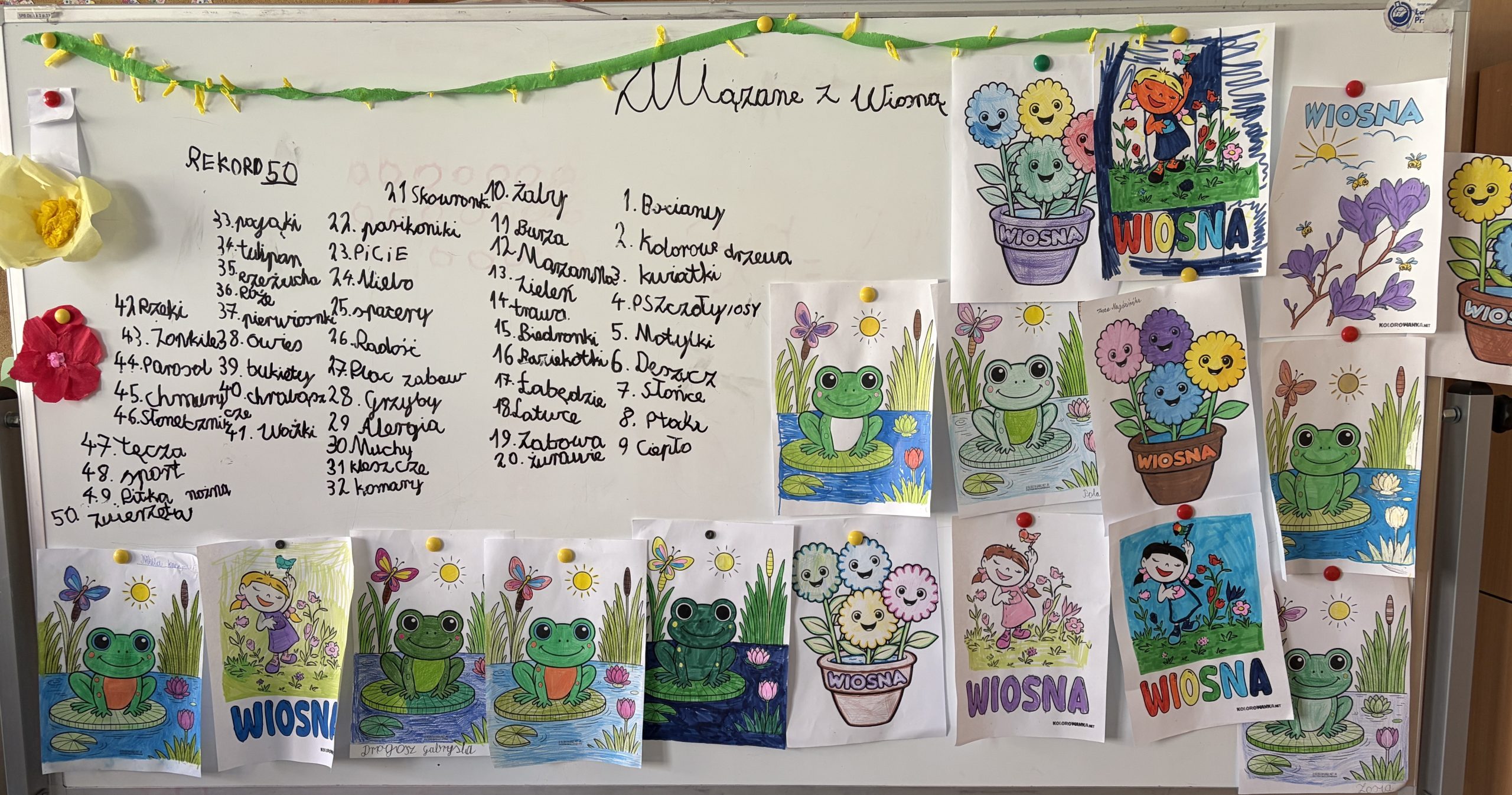 Na piątkowych zajęciach mówiliśmy o zwiastunach wiosny w przyrodzie, podjęliśmy wyzwanie grupowe na podanie jak największej liczby słów związanych z wiosną, kojarzących się dzieciom z tą porą roku - nasz rekord: 50 słów!! - wszystkie zapisał na tablicy Szymon. Potem były kolorowanki tematyczne i zabawy w grupach.