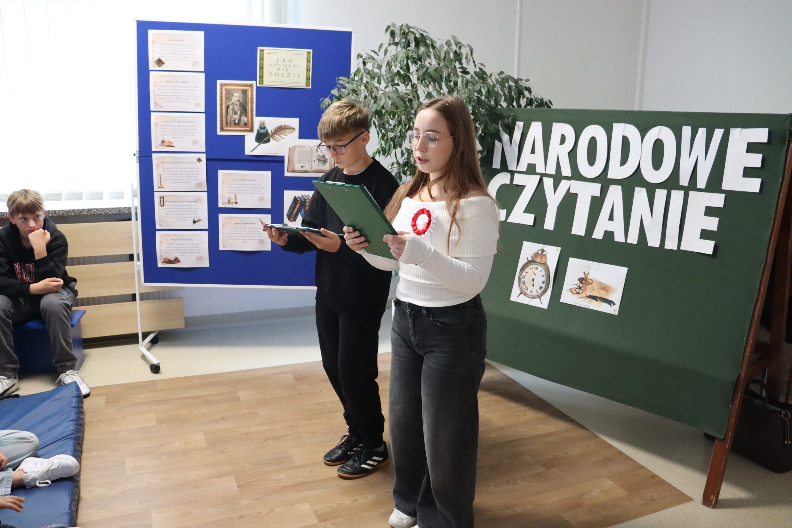 Z okazji corocznych obchodów Narodowego Czytania, uczniowie kl. 7 i 8, pod kierunkiem p. M. Kędziory, przygotowali krótką akademię, by wspólnie celebrować święto polskiej literatury. W tym roku czytaliśmy "Poezje" Jana Kochanowskiego - poety z Czarnolasu, który opiewał życie spokojne, radosne, cieszył się drobnostkami i doceniał to, czego na co dzień nie uważamy za istotne. Przedstawiciele klas prezentowali najbardziej popularne fraszki i treny autora. Wszystko to przy filiżance pysznej i aromatycznej lipy. Dlaczego? Przecież Kochanowski doceniał wartość przyrody w utworze "Na lipę". Za rok kolejne obchody Narodowego Czytania, na które zapraszamy