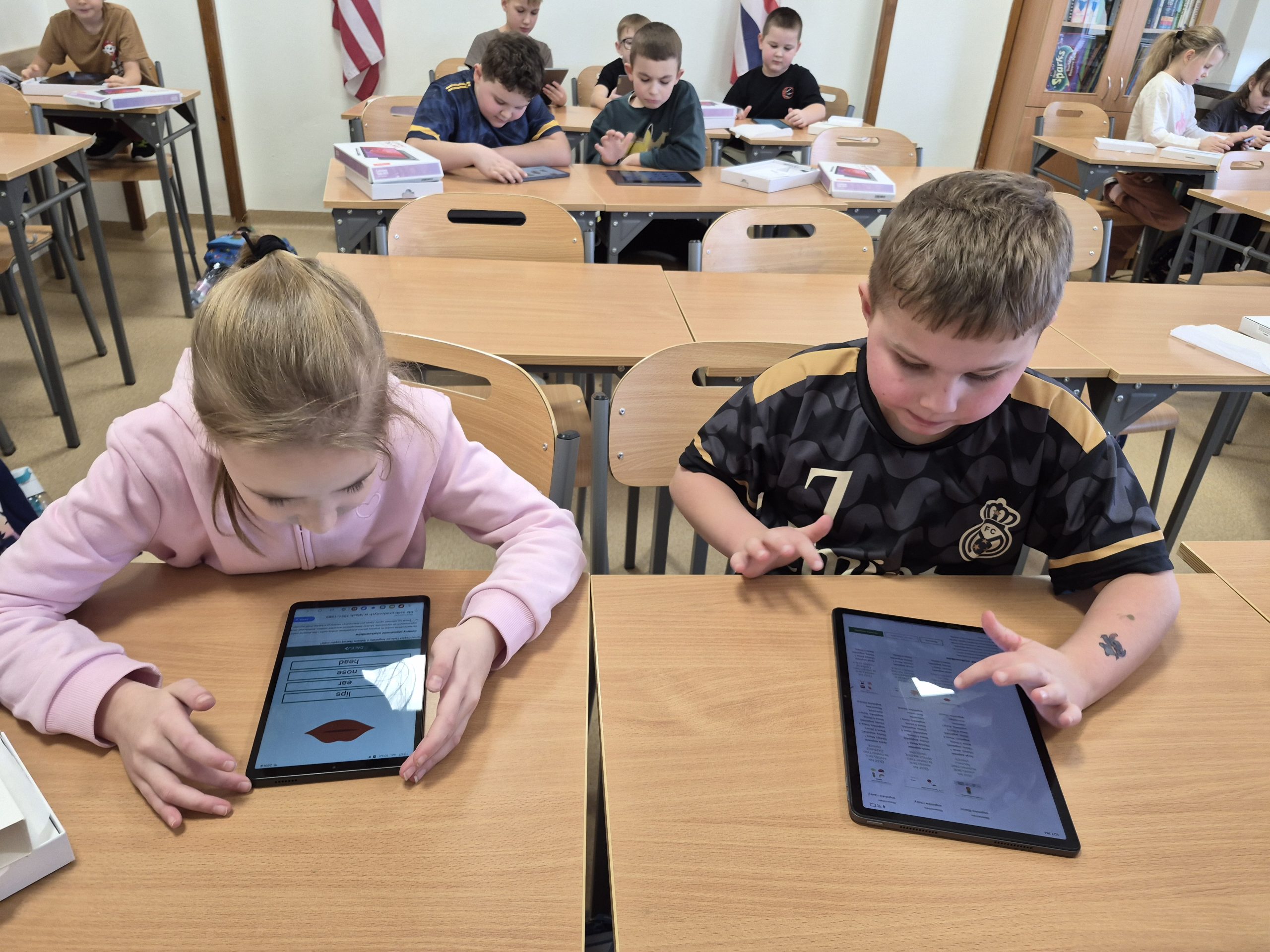 W ramach projektu „Ciekawe wyzwania = Nowe kompetencje!” w naszej szkole odbywają się dodatkowe zajęcia z języka angielskiego dla uczniów klas 1–3. Głównym celem spotkań jest rozwijanie kompetencji językowych dzieci w sposób nowoczesny, atrakcyjny i dostosowany do ich wieku oraz możliwości. Podczas zajęć uczniowie pracowali z wykorzystaniem tabletów, które stanowią cenne wsparcie w nauce języka obcego. Dzięki interaktywnym aplikacjom edukacyjnym dzieci utrwalają poznane słownictwo, ćwiczą poprawną wymowę oraz rozwijają umiejętność rozumienia ze słuchu. Nauka odbywa się poprzez gry językowe, quizy, zadania obrazkowe oraz krótkie filmy i piosenki w języku angielskim. Taka forma pracy