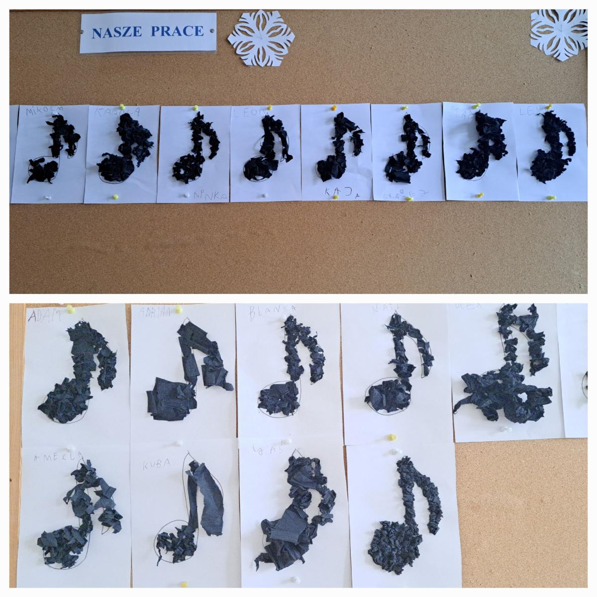 Poznaliśmy tajemniczy świat nut – jak widzicie na naszej tablicy, każda z nich ma swój niepowtarzalny kształt (i charakter!). Wyklejanie ich czarną bibułą było świetnym ćwiczeniem dla małych rączek. 👋🎵